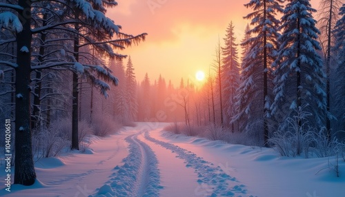 © SwathiFX, Naklejka premium Snowy path leading to a winter sunset