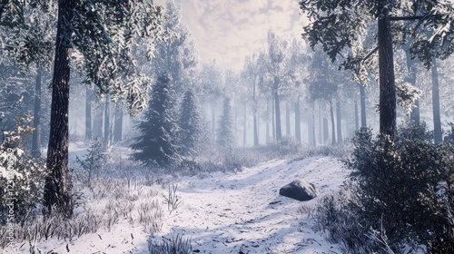 © Ikhsan, Naklejka premium Snowy path through a misty winter forest.