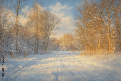 © EUT, Fototapeta premium Snowy path through sunlit winter woods. Ideal for winter, nature, serenity themes; evokes peace and tranquility.