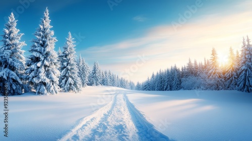 © Ndoomyim, Obraz premium Snowy Path Through Winter Forest at Sunrise
