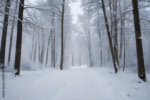 © Bulbul, Naklejka premium Snowy path winding through a serene winter forest