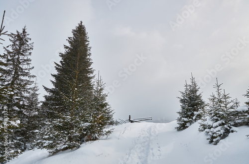 © Ryzhkov Oleksandr, Fototapeta premium Snowy path with footprints leading over a hill into dense fog.