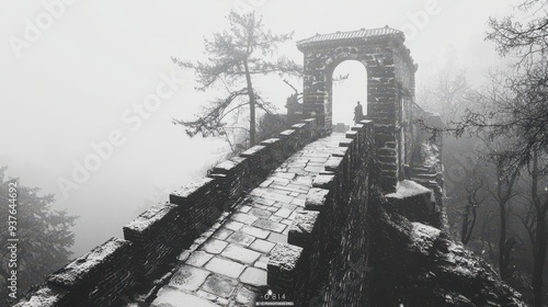 © BOJOShop, Fototapeta premium Snowy Pathway on the Great Wall of China in Foggy Landscape