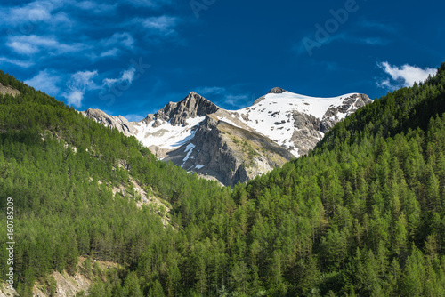 Obraz premium Snowy peak and forest in Alps,France