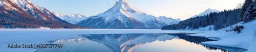 © Machita, Fototapeta premium Snowy peak of Monte Rosa reflected in frozen Valsesia lake, monte rosa, italian alps, winter