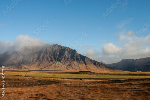 © Blanca, Fototapeta premium Snowy peaks reflect in a serene mountain lake at sunrise, a breathtaking natural Nordic landscape in Iceland