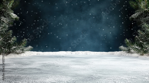 © siraphol, Fototapeta premium Snowy pine branches winter night with falling snow and empty foreground for text