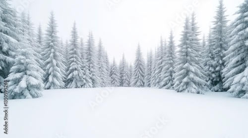 Naklejka premium Snowy pine forest. A pristine winter wonderland, frosted trees stand tall in a vast expanse of snow