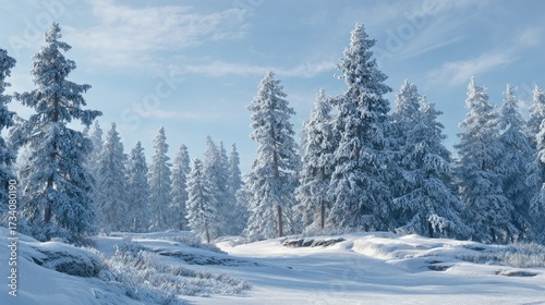 © Ilham, Naklejka premium Snowy pine forest under a bright sky