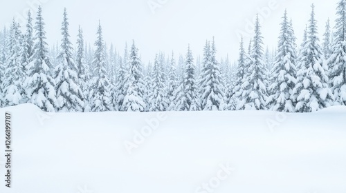 Naklejka premium Snowy pine forest, winter wonderland, tranquil scene, serene nature, background image, landscape photography, ideal for winter themes, perfect for winter scenes