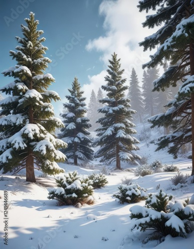 Naklejka premium Snowy pine trees and bushes in a winter wonderland, cold, background, winter,...