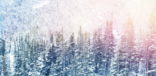 © vectorfusionart, Obraz premium Snowy pine trees on alp mountain slope