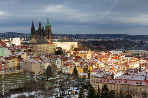 © Kajano, Fototapeta premium Snowy Prague Lesser Town with gothic Castle from Hill Petrin, Czech Republic