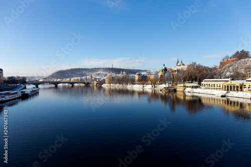 Fototapeta premium Snowy Prague Lesser Town with Prague Castle above River Vltava, Czech republic