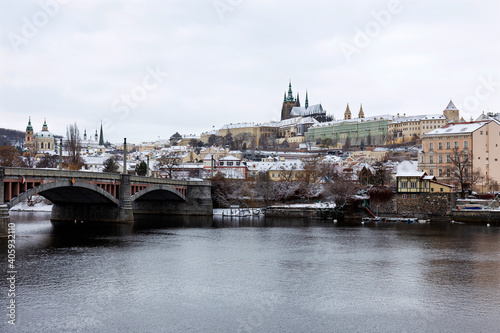 Fototapeta premium Snowy Prague Lesser Town with Prague Castle above River Vltava, Czech republic