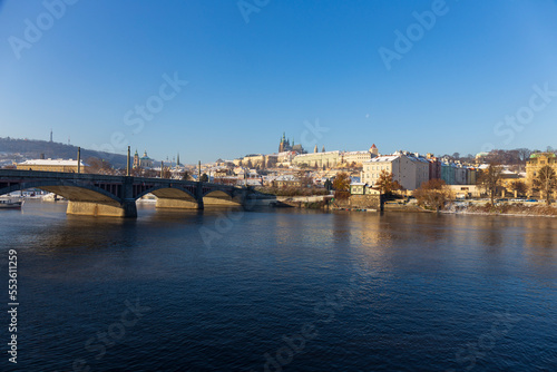 Obraz premium Snowy Prague Lesser Town with Prague Castle above River Vltava in the sunny...