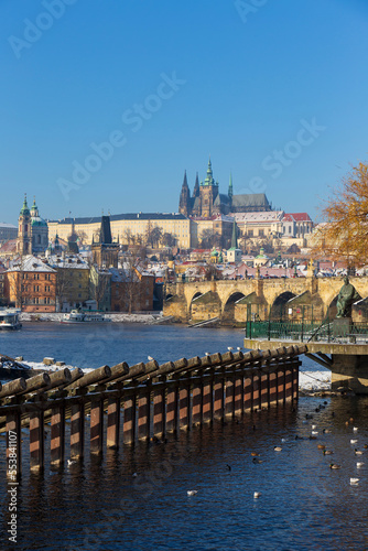 Fototapeta premium Snowy Prague Lesser Town with Prague Castle above River Vltava in the sunny...
