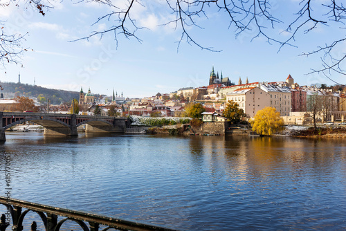 Obraz premium Snowy Prague Lesser Town with Prague Castle above River Vltava in the sunny...