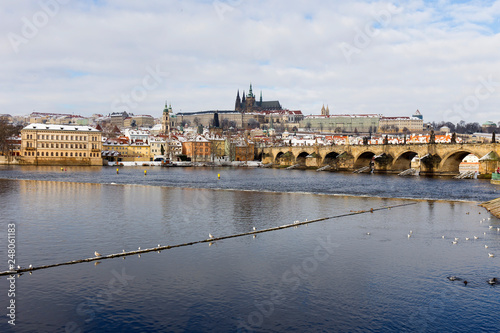 Fototapeta premium Snowy Prague Lesser Town with Prague Castle and Charles Bridge, Czech republic