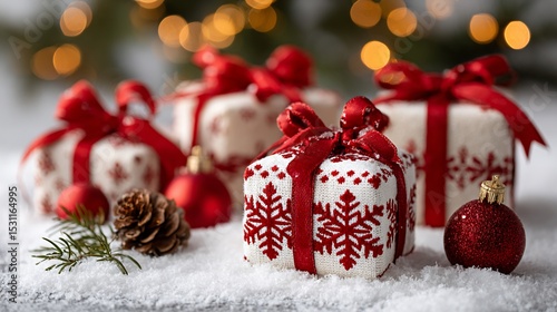 © Yolo, Obraz premium Snowy presents pinecone ornaments and holiday glow