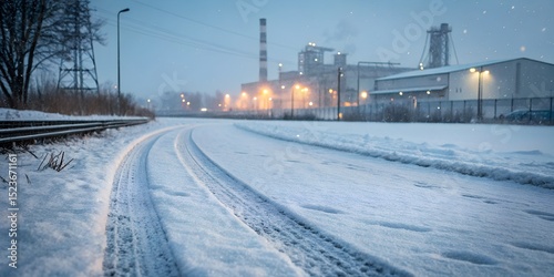 Obraz premium Snowy railway tracks and industrial buildings create a cold atmospheric view