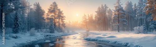 © kramynina, Fototapeta premium Snowy river in a forest with trees and snow, winter forest background , Banner