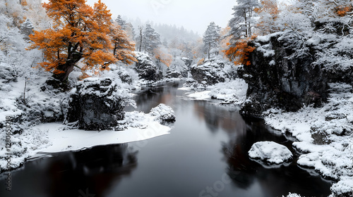 © KUTIL KURO, Fototapeta premium Snowy river scene, orange trees, winter landscape, tranquil nature