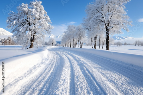 © AltisArt, Obraz premium Snowy Road Winding Through Snow Covered Trees on a Sunny Winter