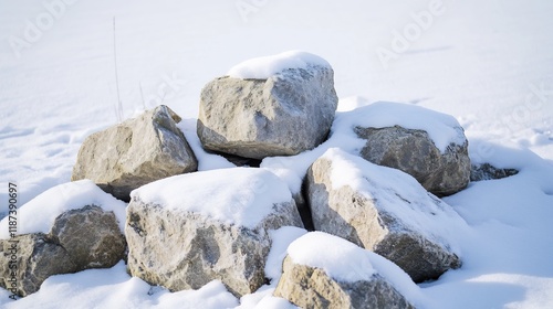 Fototapeta premium Snowy rocks winter landscape, cold field background, nature texture