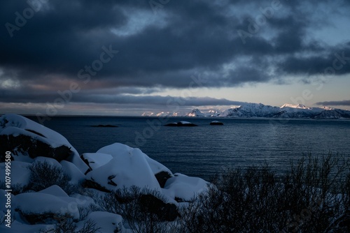 © Wirestock, Obraz premium Snowy seascape with distant mountains