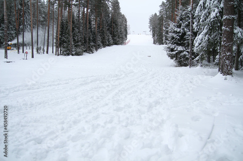 © dainav, Obraz premium Snowy spruce forest on a white background.
