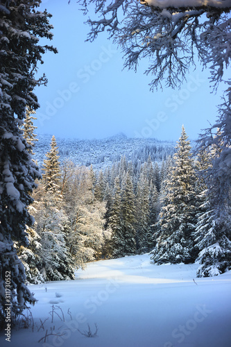 © yallowww, Fototapeta premium Snowy spruce trees against the background of rocky mountains.