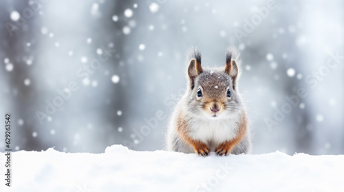 Fototapeta premium Snowy squirrel on snow background with empty space for text