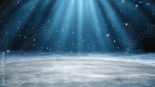 © siraphol, Fototapeta premium Snowy stage illuminated by blue spotlight with falling snow and frosted ground