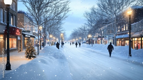 © starush, Fototapeta premium Snowy street scene with people strolling under glowing streetlights, AI