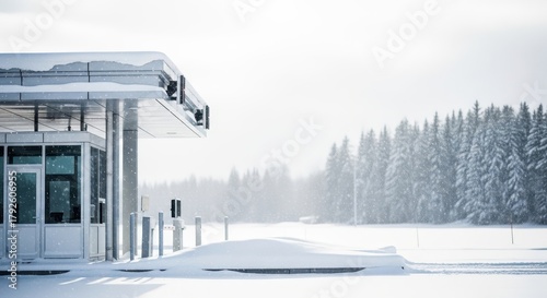 © antuanetto, Obraz premium Snowy toll booth in winter landscape with trees in background