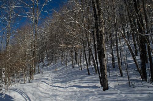 Obraz premium Snowy trail up a slope in the Maine woods.