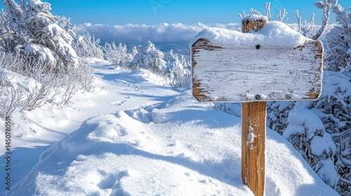 © Andy, Naklejka premium Snowy trail with blank wooden sign, blue sky above