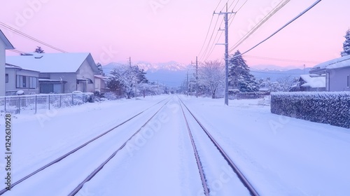 Obraz premium Snowy Train Tracks at Peaceful Dawn Suburban Scene