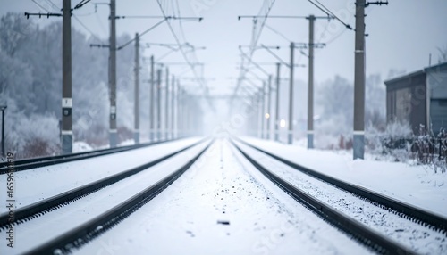 Fototapeta premium Snowy train tracks stretching into a hazy winter scene