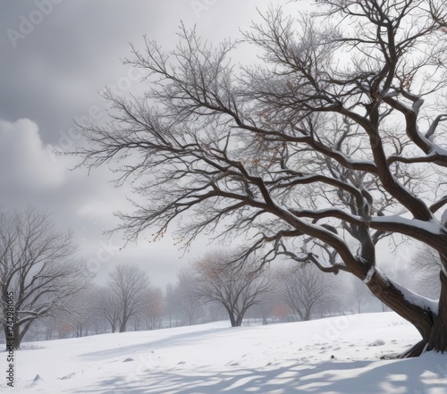 © Prasert, Obraz premium Snowy tree branches stretching towards a grey sky, cold weather, snow-covered trees, serene landscape