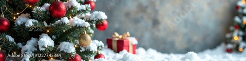 © Anulak, Fototapeta premium Snowy tree with red gold ornaments against textured wall background and empty space, Snowy Tree, Gift Box