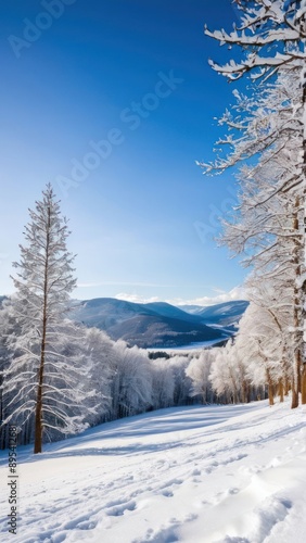 Fototapeta premium snowy trees and snow covered ground with a blue sky in the background