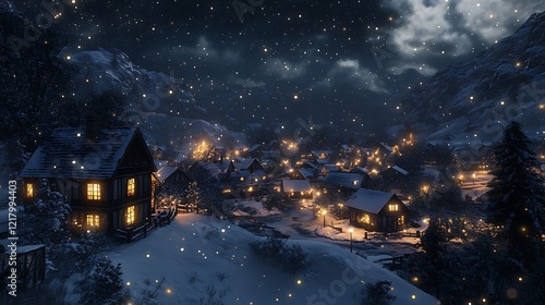 © SANDJAYA, Fototapeta premium Snowy Village at Night with Glowing Lights
