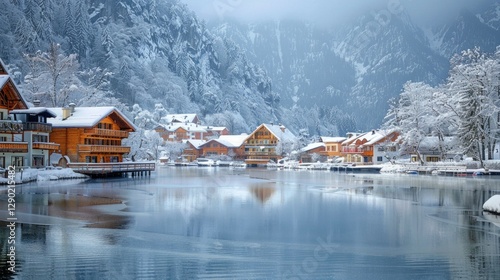 © Fitriaa, Fototapeta premium Snowy Village by the Lake