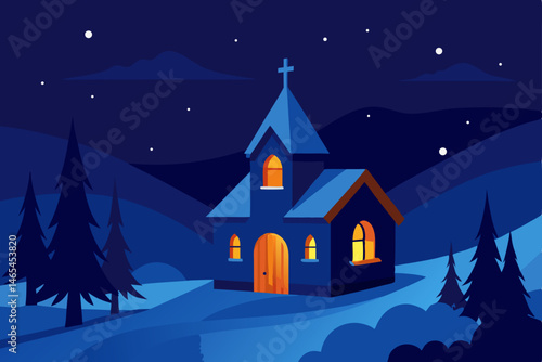 © Kechali, Fototapeta premium snowy village chapel at night glowing windows