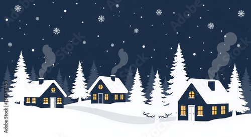 Fototapeta premium Snowy Village Houses Winter Holiday Dark Blue White Trees Smoke Falling...