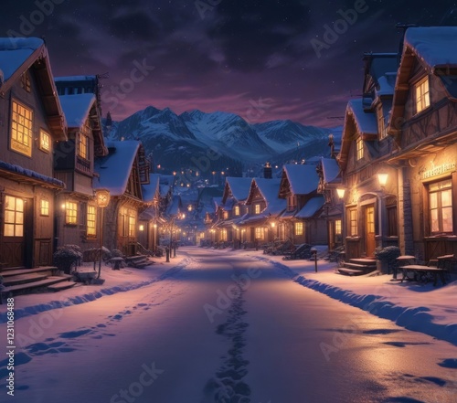 Naklejka premium Snowy village illuminated by bright neon street lights at twilight, twilight,...