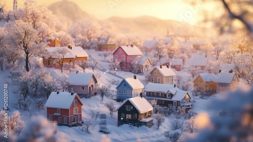 © afif, Fototapeta premium Snowy village nestled in a valley at sunrise