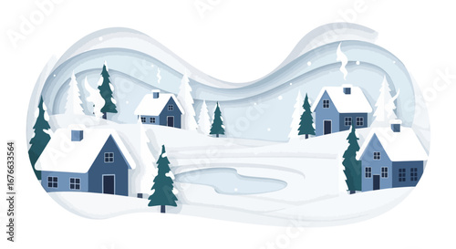 Fototapeta premium Snowy Village Scene with Blue Houses and Evergreen Trees in Winter